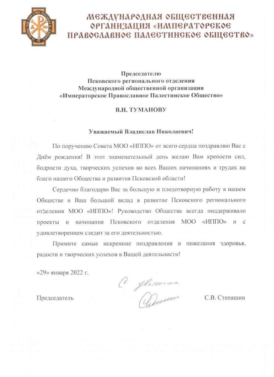 29 января день рождения отмечает руководитель Псковского отделения Императорского Православного Палестинского Общества Владислав Туманов.