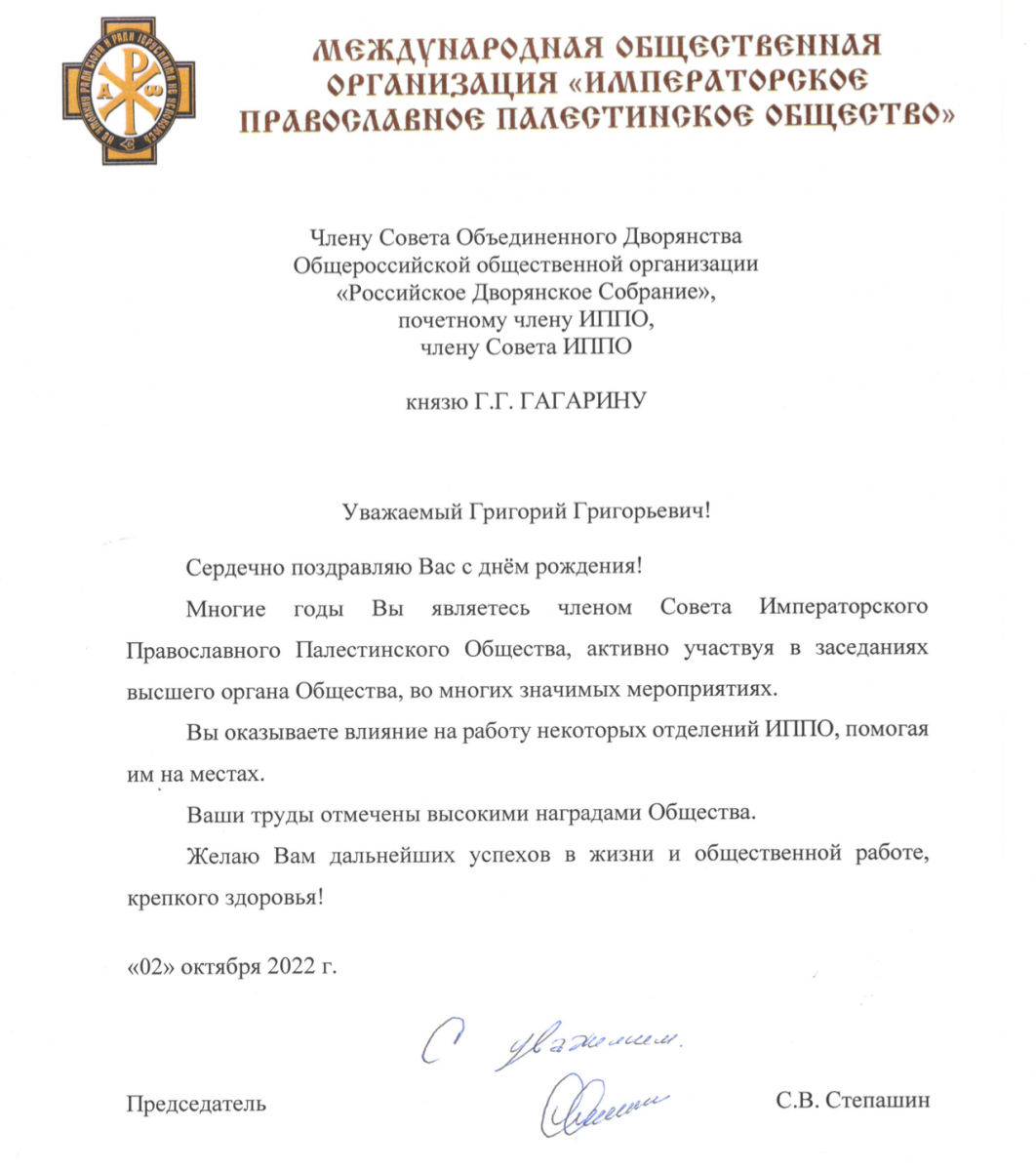 2 октября день рождения отмечает Почётный член ИППО, член Совета Общества князь Григорий Гагарин.