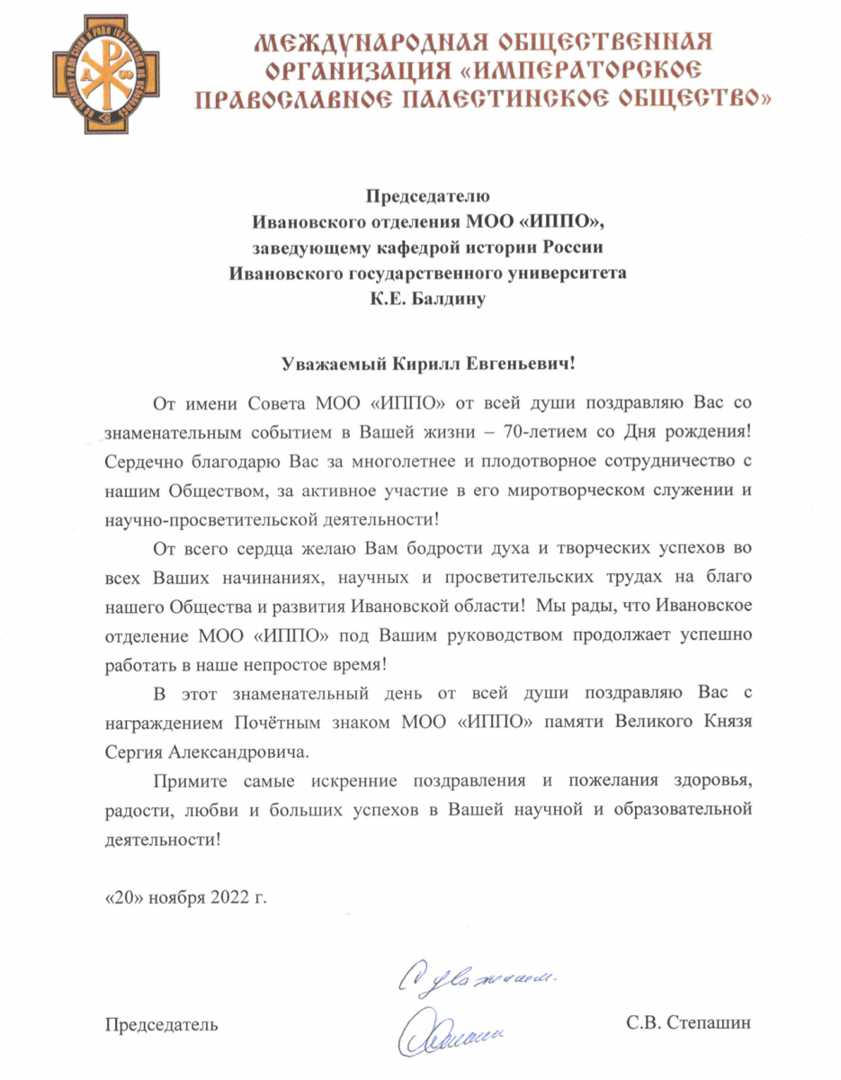 Председатель ИППО Сергей Степашин поздравил с днём рождения руководителя Ивановского отделения Общества Кирилла Балдина
