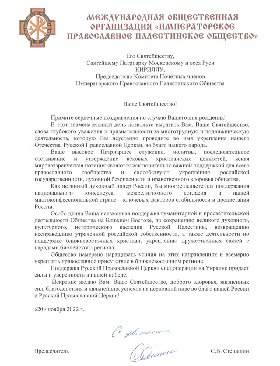 Председатель ИППО Сергей Степашин поздравил с Днём рождения Святейшего Патриарха Московского и всея Руси Кирилла
