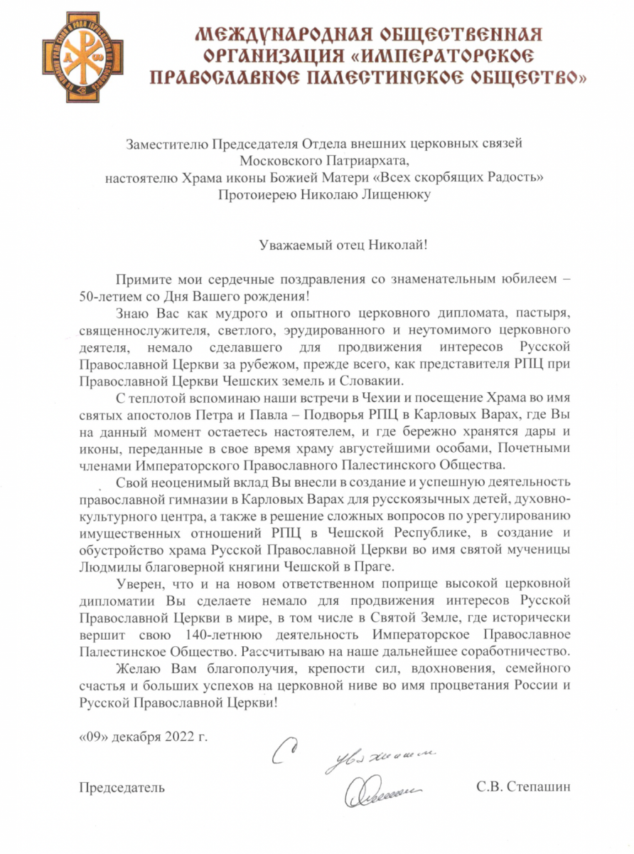 Поздравление в его адрес направил Председатель Императорского Православного Палестинского Сергей Степашин.