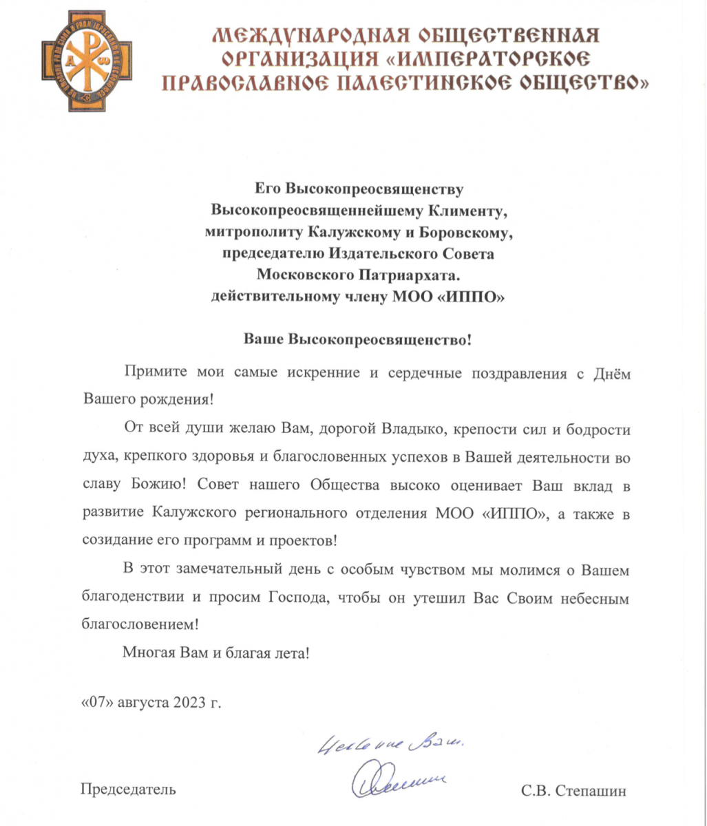 Председатель ИППО Сергей Степашин поздравил с днём рождения митрополита Калужского и Боровского Климента