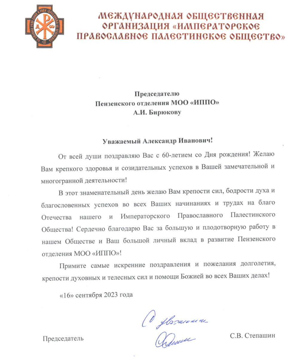 Председатель ИППО Сергей Степашин поздравил с днём рождения руководителя Пензенского отделения Общества Александра Бирюкова