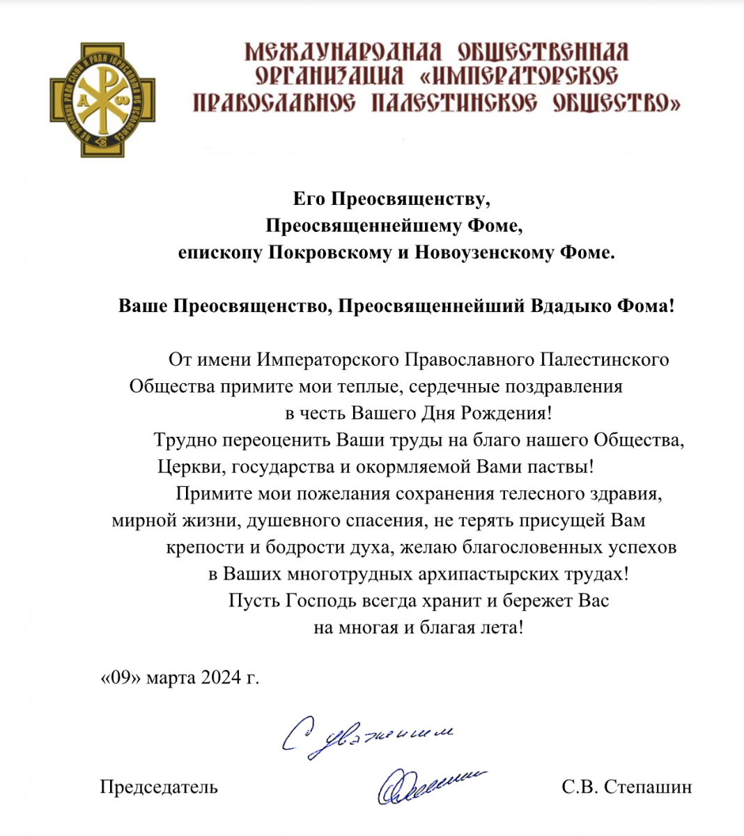 Поздравление в адрес владыки Фомы направил Председатель Общества Сергей Степашин: