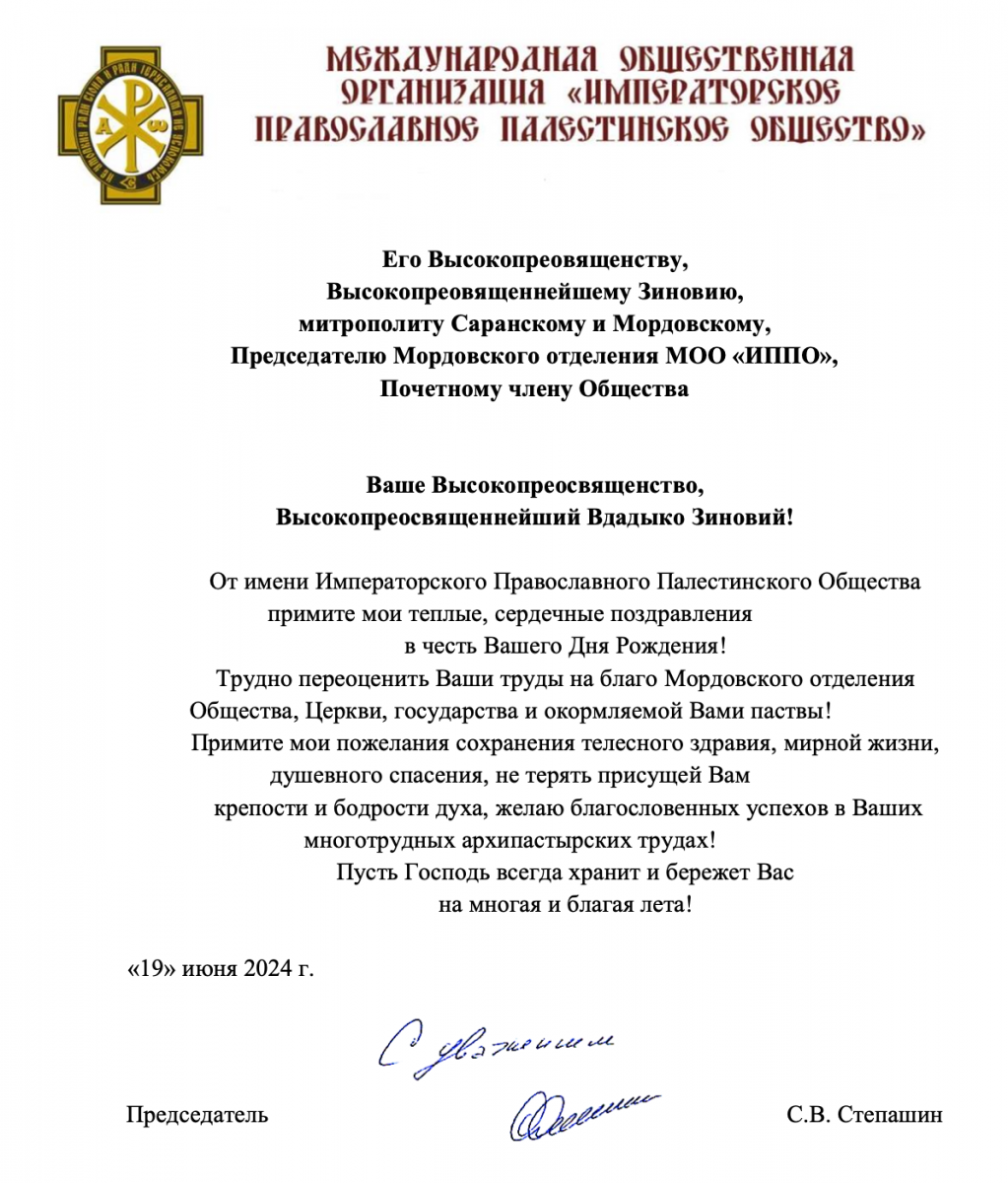 Поздравление в адрес владыки Зиновия направил Председатель Императорского Православного Палестинского Общества Сергей Степашин.