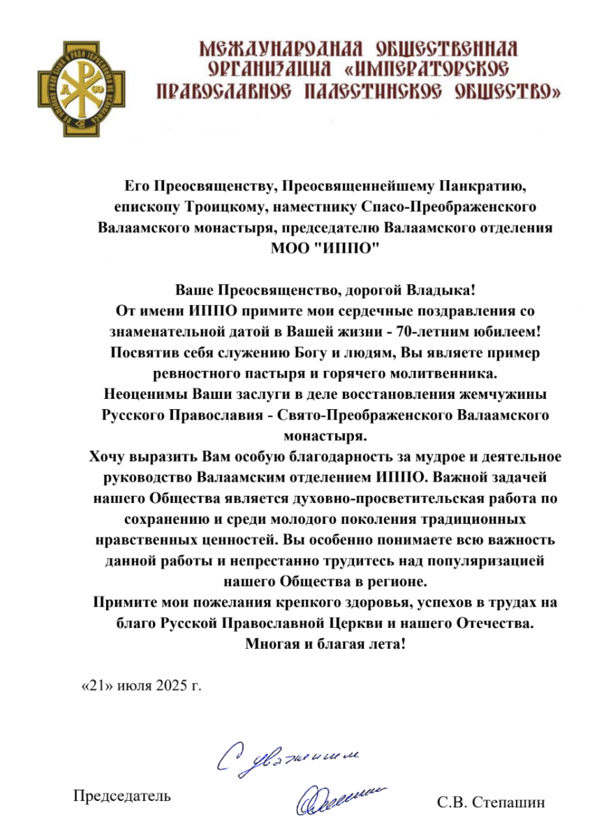 Поздравление в адрес владыки Панкратия направил Председатель ИППО Сергей Степашин.