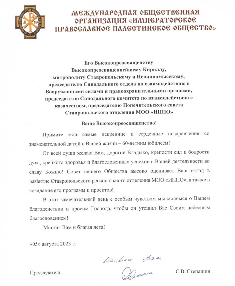 5 августа 60-летие отмечает председатель Синодального отдела по взаимодействию с Вооруженными силами и правоохранительными органами, председатель Синодального комитета по взаимодействию с казачеством, председатель Попечительского совета Ставропольского отделения ИППО митрополит Ставропольский и Невинномысский Кирилл.