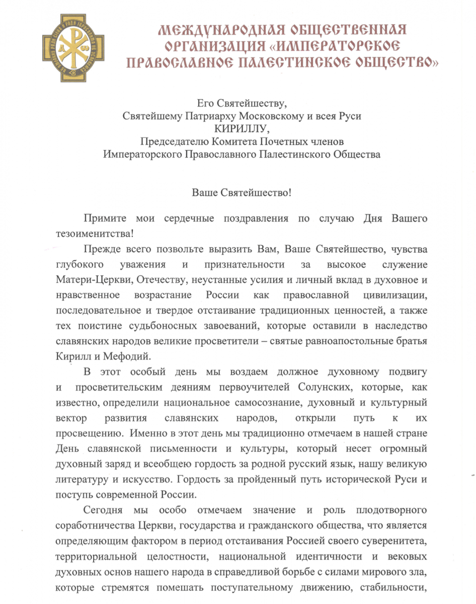 24 мая Святейший Патриарх Московский и всея Руси Кирилл, Председатель Комитета Почётных членов ИППО, отмечает день тезоименитства.