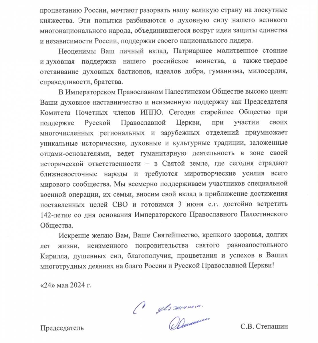 Председатель ИППО Сергей Степашин направил поздравительное письмо в адрес Его Святейшества: