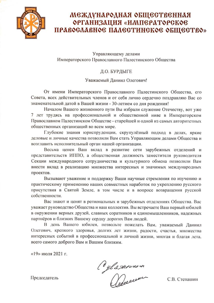 Даниил Бурдыга начал свою трудовую и общественную деятельность в Императорском Православном Палестинском Обществе 1 июля 2014 года.