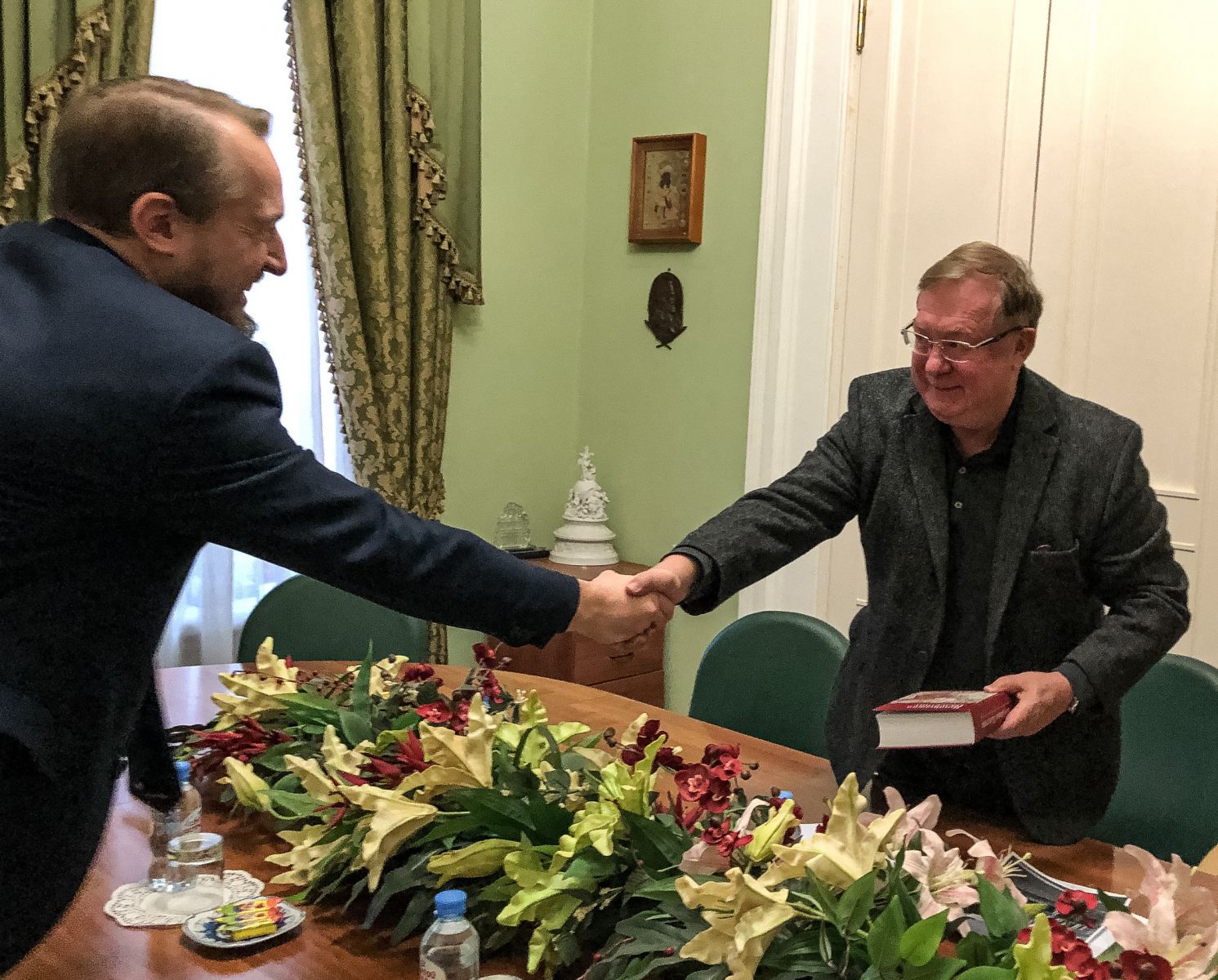 В завершение встречи Олег Робинов вручил Сергею Степашину коллективную монографию «Воображая Палестину: святая земля и русская идентичность в XIX — начале XXI в.», написанную при участии членов Молодежной секции ИППО Александра Валитова и Элизы Григорян, а также анонсировал новый научный проект, посвящённый изучению традиции создания пространственных копий Святой Земли.
