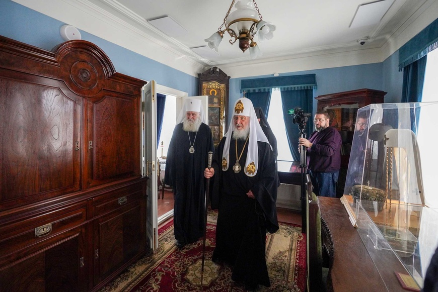 Святейший Патриарх Кирилл осмотрел переднюю при входе в жилые помещения, комнату келейника (караульную для сотрудников ГПУ, которые круглосуточно следили за Патриархом во время его домашнего ареста), приемную-столовую, комнату с печью перед покоями святителя Тихона, кабинет и келью.