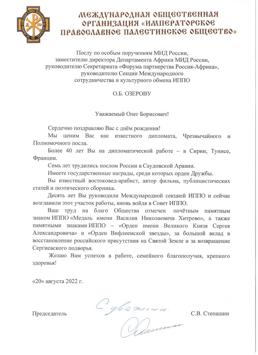 Поздравление в адрес Олега Борисовича направил Председатель ИППО Сергей Степашин.
