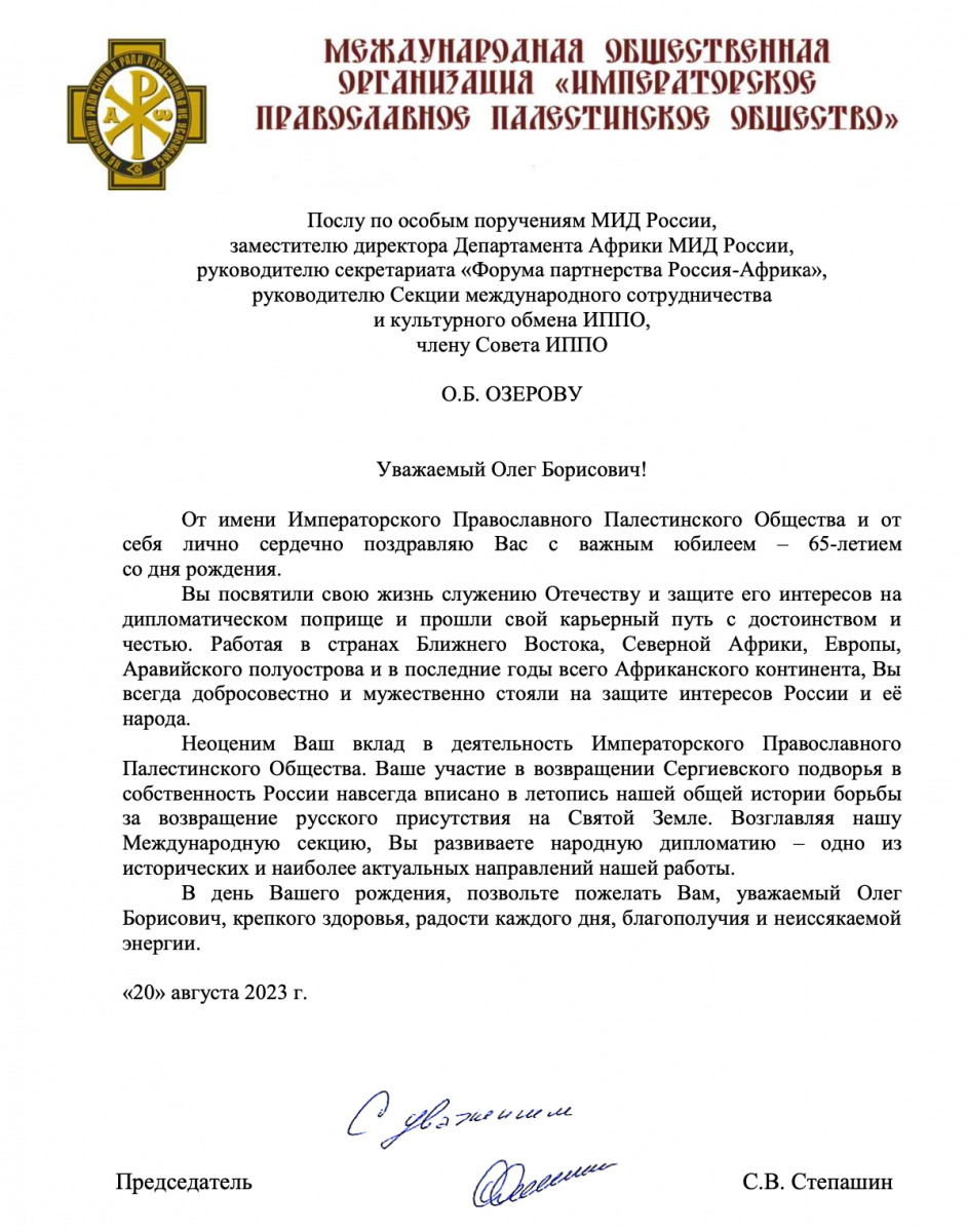 20 августа день рождения отмечает Посол по особым поручениям МИД России, заместитель директора департамента Африки МИД России, руководитель секретариата «Форума партнёрства Россия-Африка», руководитель Секции Международного сотрудничества и культурного обмена ИППО, член Совета Общества Олег Озеров.