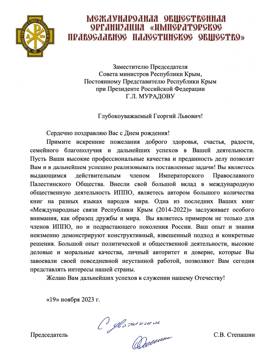 Поздравление в адрес Георгия Львовича направил Председатель Общества Сергей Степашин.