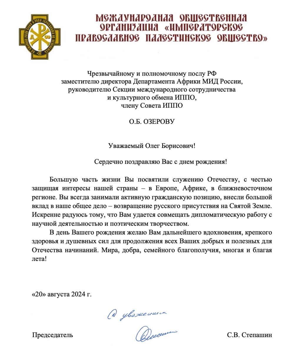 20 августа день рождения отмечает Чрезвычайный и полномочный посол РФ, заместитель директора департамента Африки МИД России, руководитель Секции Международного сотрудничества и культурного обмена ИППО, член Совета Общества Олег Озеров.