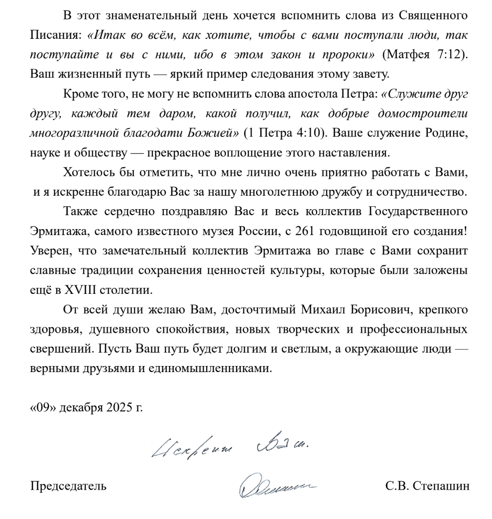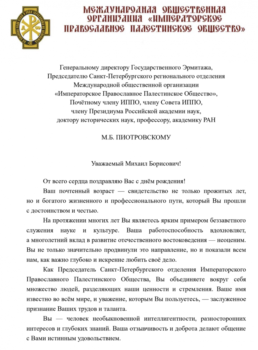 Председатель ИППО Сергей Степашин тепло поздравил Михаила Борисовича, поблагодарив за активную работу в Императорском Православном Палестинском Обществе, за содействие в реализации научных и культурно-просветительских проектов.