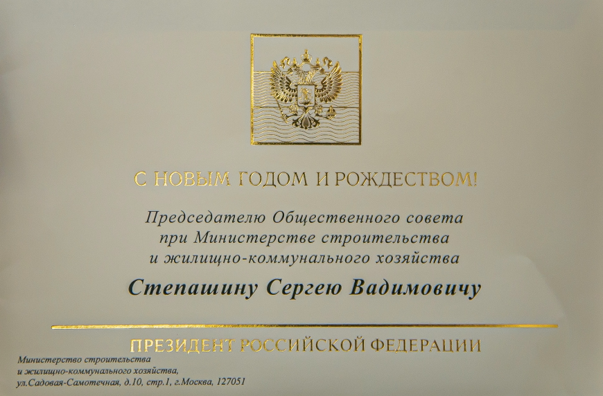 Президент Российской Федерации Владимир Путин направил поздравление в адрес Председателя Общественного совета при Министерстве строительства и жилищно-коммунального хозяйства, Председателя ИППО Сергея Степашина по случаю Нового года и Рождества Христова.