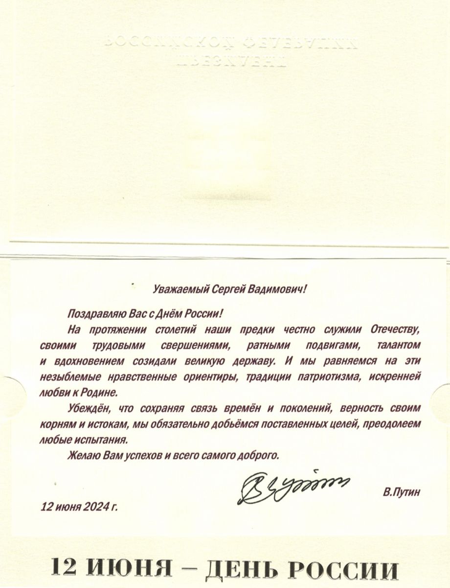 Президент Российской Федерации Владимир Путин поздравил Сергея Степашина с Днём России
