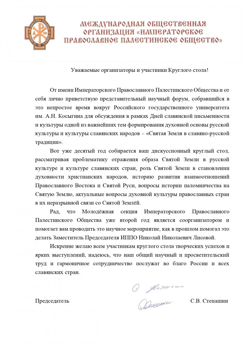 Сборник открывает Приветственное слово Председателя ИППО Сергея Степашина организаторам и участникам круглого стола «Святая Земля в славяно-русской традиции».