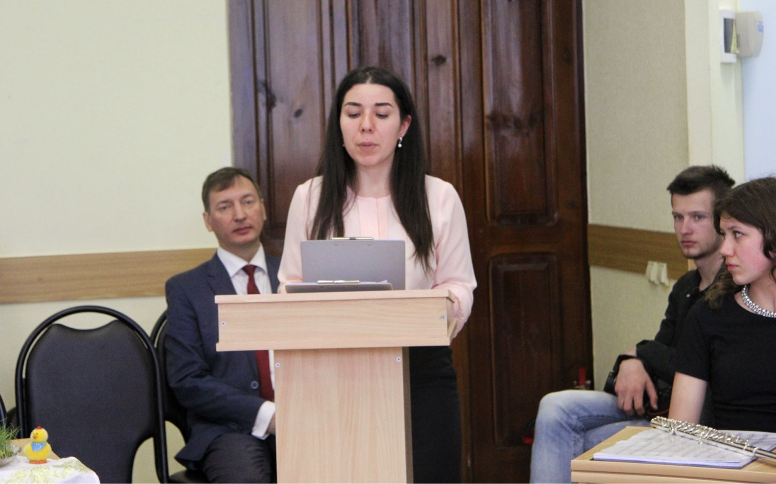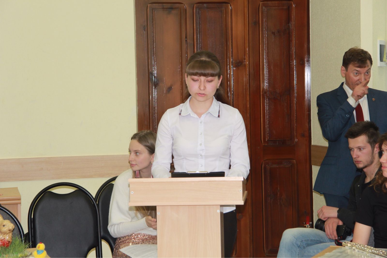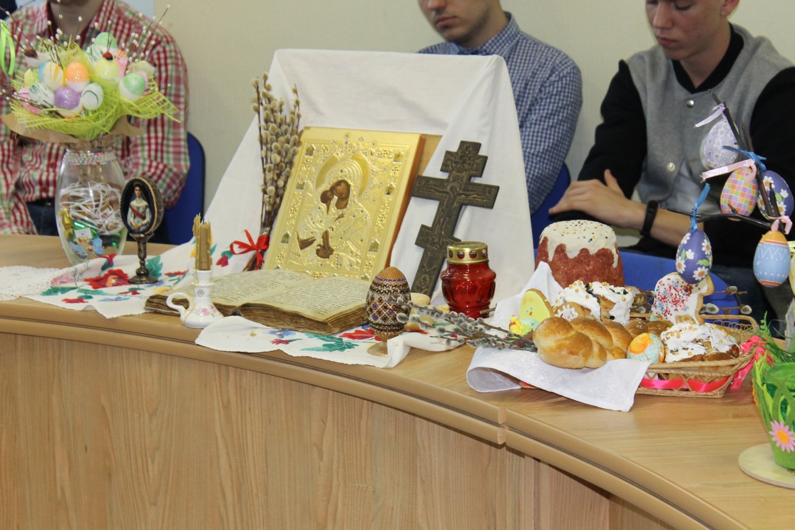 О чуде схождения Благодатного огня в Великую Субботу в иерусалимском Храме Гроба Господня рассказала студентка 4 курса факультета экономики, сервиса и предпринимательства Лилит Симонян, русским пасхальным традициям было посвящено выступление студентки 2 курса Виктории Фроловой.