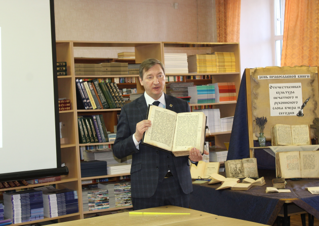 Студенты с интересом рассматривали старинные книги, знакомились с антикварными и букинистическими редкостями, представленными на выставке. Среди представленных книг были старопечатные и рукописные церковно-богослужебные и богословские книги XVIII-XIX вв., напечатанные в Москве, Киеве, Харькове, Вене, Варшаве и других городах Европы и России на церковно-славянском, греческом и латинском языках. Среди выставленных книг были редкие издания в старой русской орфографии, конца 1920-х – начала 1930-х годов, напечатанные в Варшаве и Париже русскими эмигрантами и посвящённые проблемам европейского осмысления церковной жизни в довоенном СССР. Интерес собравшихся вызвал Путеводитель по Святой Земле, изданный в Одессе в 1894 году с дарственной надписью игумена одесского Свято-Ильинского подворья, в котором останавливались русские паломники, направлявшиеся морем в Палестину и на Святой Афон. Также, среди старинных книг были выставлены письменные принадлежности конца XIX – начала XX вв., любезно предоставленные настоятелем Покровского кафедрального собора г. Шахты священником Александром Теличкиным.