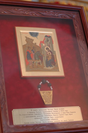 Для передачи святынь прибыли: представители Российского Благородного Собрания - Андрей Валерьевч Гусаров и Евгений Александрович Будник, член ИППО, вице-президент благотворительного фонда св. мученика Вонифатия Наталья Сергеевна Мезенцева и сотрудник Министерства регионального развития России Игорь Владимирович Николаев.