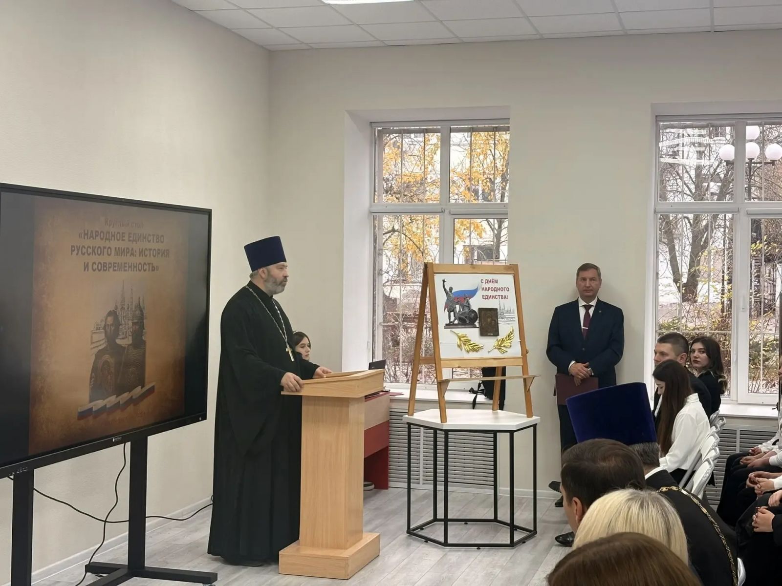 Присутствующие говорили об истории и смыслах праздника Дня народного единства, об исторической значимости единства народов России, о истории и символах Русского мира, осмотрели выставки, подготовленные студенческим научным кружком «Православный Восток» кафедры «Православная культура и теология» и библиотекой института. На выставках была представлена старинная литература об истории почитания Казанской иконы Пресвятой Богородицы, старопечатные молитвословия и службы празднику, паломнические Богородичные иконы и другие предметы, раскрывающие исторические особенности русской православной культуры.