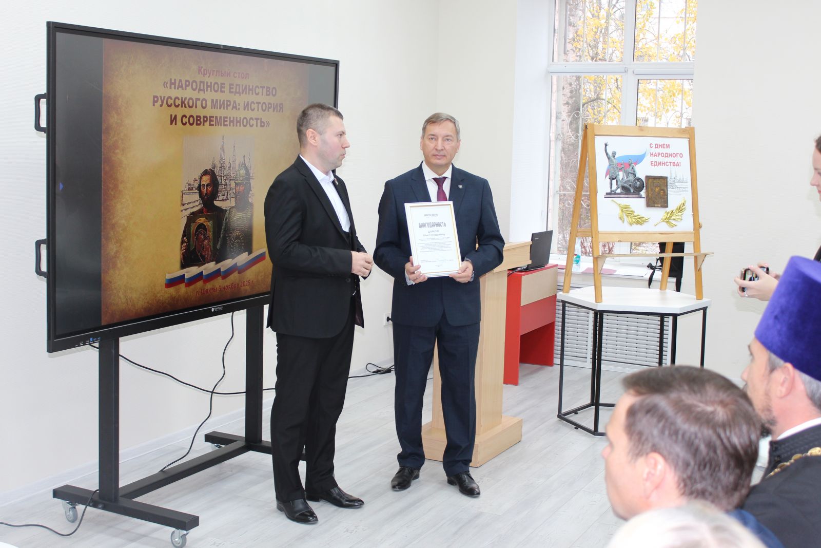 Дмитрий Самарский вручил Благодарность руководителя общественного движения «Волонтёры культуры» в Ростовской области «за значительный вклад в духовно-нравственное воспитание молодёжи, формирование гражданской идентичности и развитие гармоничной личности с патриотическими взглядами, высокий профессионализм и личную преданность делу» старшему преподавателю кафедры «Православная культура и теология», древлехранителю Шахтинской епархии, члену Совета Ростовского отделения ИППО Илье Шаркову.