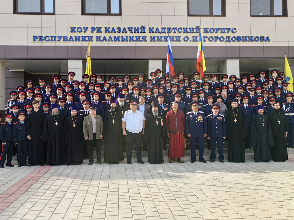По видеосвязи присоединились: руководитель отдела по взаимодействию с казачеством Ростовской-на-Дону епархии, войсковой священник Всевеликого войска Донского, настоятель Патриаршего Вознесенского войскового всеказачьего собора г. Новочеркасска протоиерей Георгий Сморкалов и заместитель руководителя Нижегородского отделения ИППО, игумен Нижегородского Вознесенского Печерского мужского монастыря архимандрит Тихон (Затекин). На торжестве присутствовали кадеты и преподаватели Казачьего корпуса, представители родительской общественности, священнослужители Элистинской и Калмыцкой епархии и казаки Калмыцкого казачьего округа Всевеликого войска Донского.