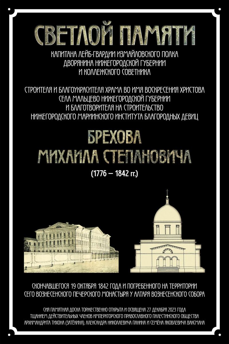 На памятной доске была сделана надпись: «Светлой памяти капитана лейб-гвардии Измайловского полка дворянина Нижегородской губернии и коллежского советника Михаила Степановича Брехова (1776 — 1842 г.) строителя и благоукрасителя храма во имя Воскресения Христова села Мальцево Пильненского района Нижегородской области и жертвователя на строительство нижегородского Мариинского института благородных девиц, скончавшегося 19 октября 1842 года и погребенного на территории Нижегородского Вознесенского Печерского мужского монастыря у алтаря Вознесенского собора. Сия памятная доска торжественно открыта и освящена 27 декабря 2023 года тщанием действительных членов Императорского православного палестинского общества архимандрита Тихона (Затёкина), Александра Николаевича Панина и Семена Яковлевича Ваксмана».