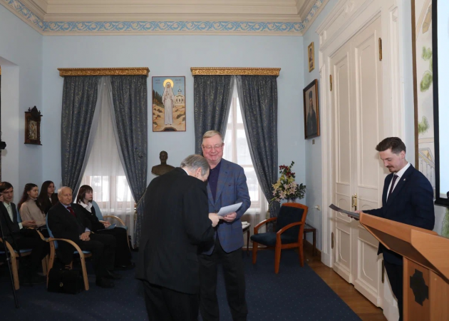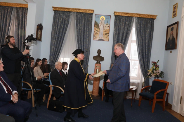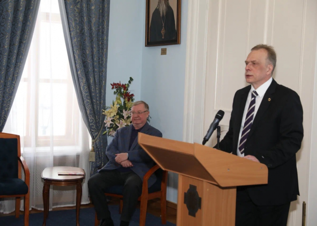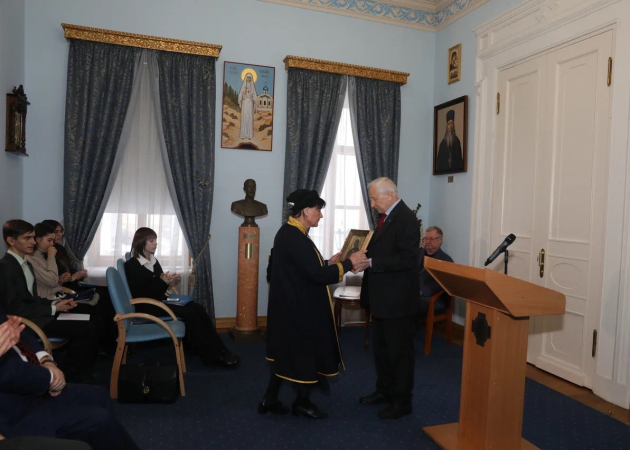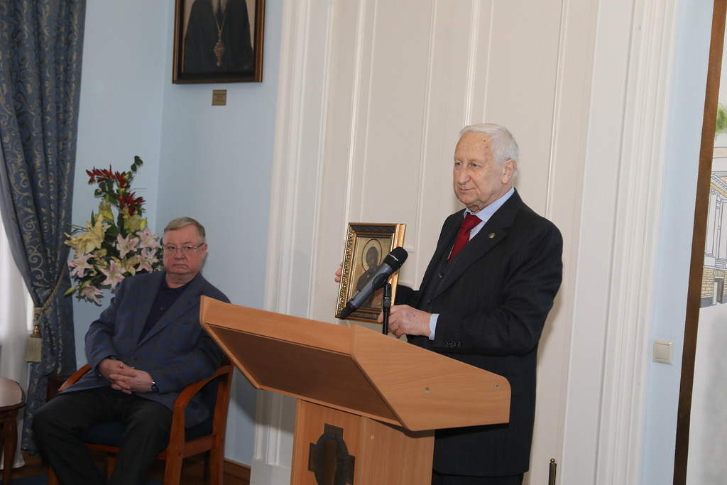 В завершении своего выступления Борис Иванович вручил икону Александра Невского покровителя дипломатов, преподавателям русско-греческой православной школы в ИППО Наталье Николау и Василию Щербакову.