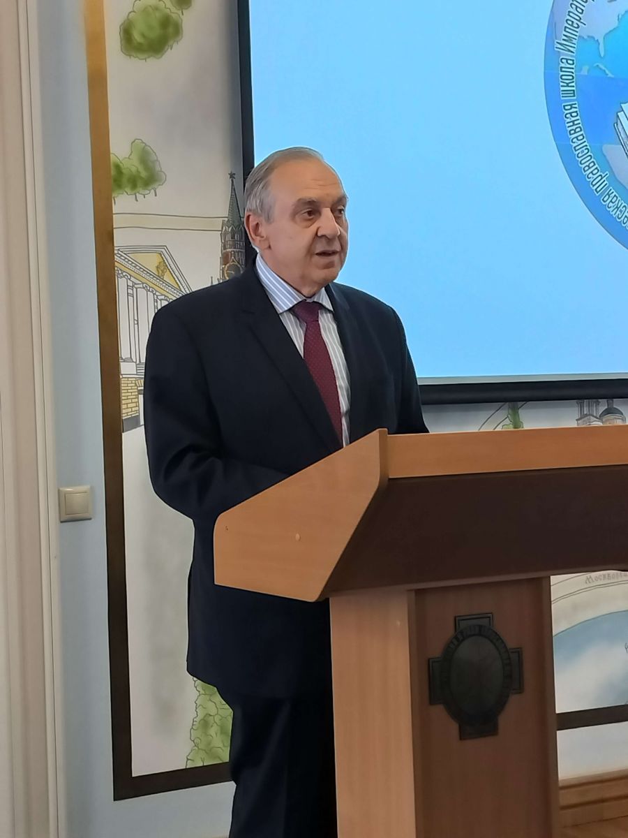Далее с приветственным словом выступил действительный член ИППО, Заместитель Председателя Совета министров Республики Крым, Постоянный Представитель Республики Крым при Президенте Российской Федерации, Посол РФ в Республике Кипр /1996-1999 г.г./ Георгий Мурадов. Георгий Львович подчеркнул важность изучения греческого языка, как одного из первых языков на планете, языка науки, культуры, медицины, что греческий язык тесно связан с русским языком, также является языком православного христианства.