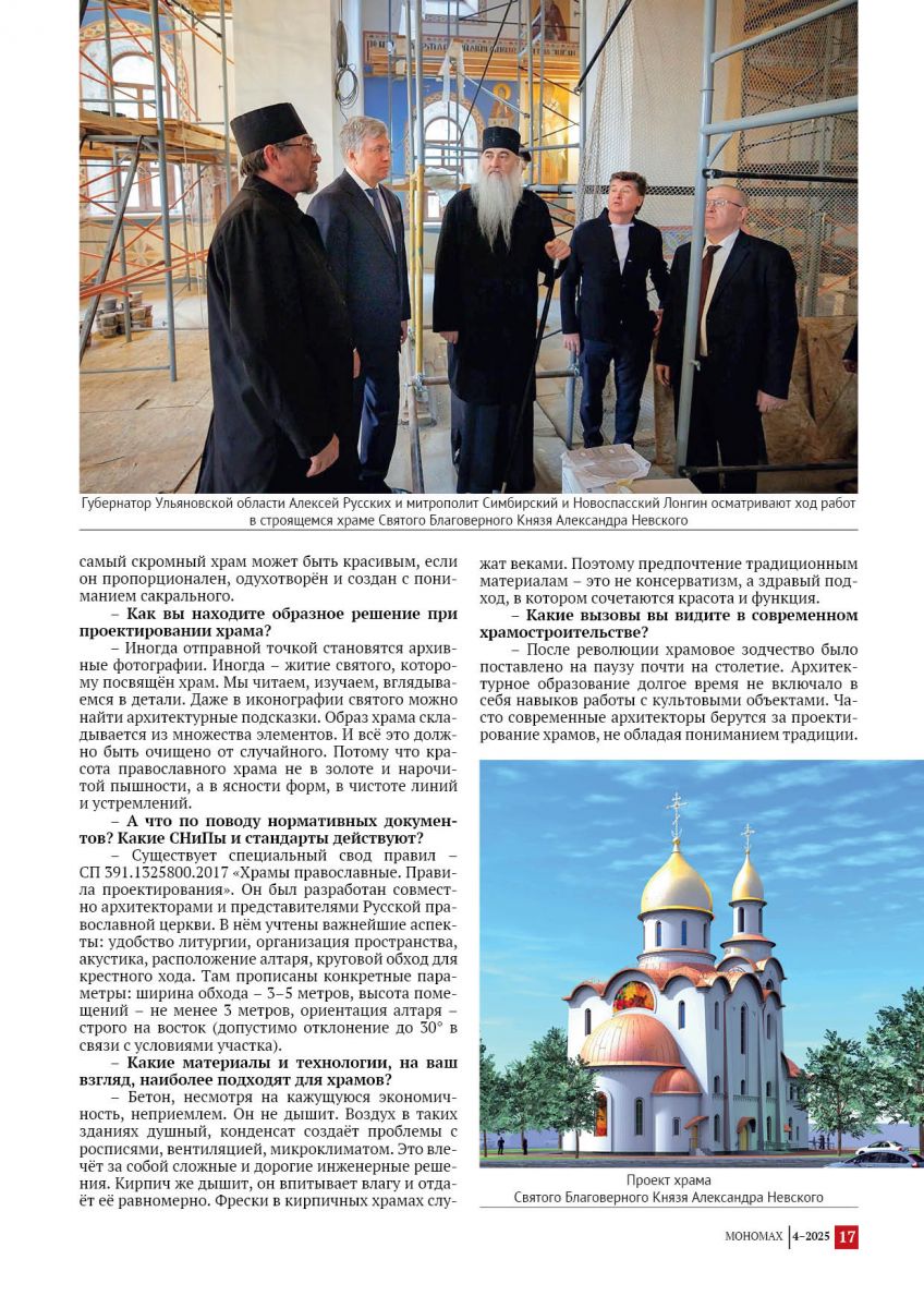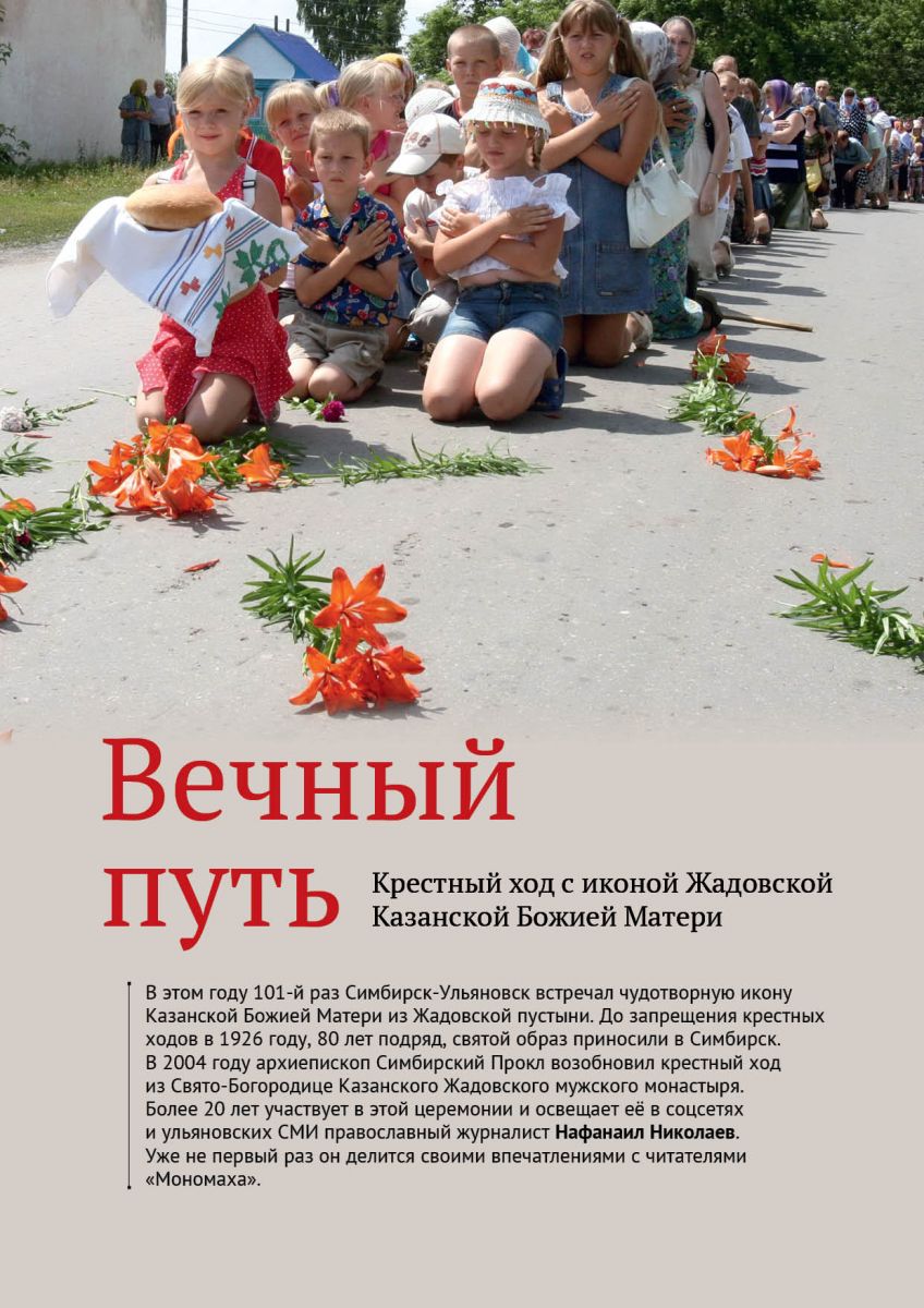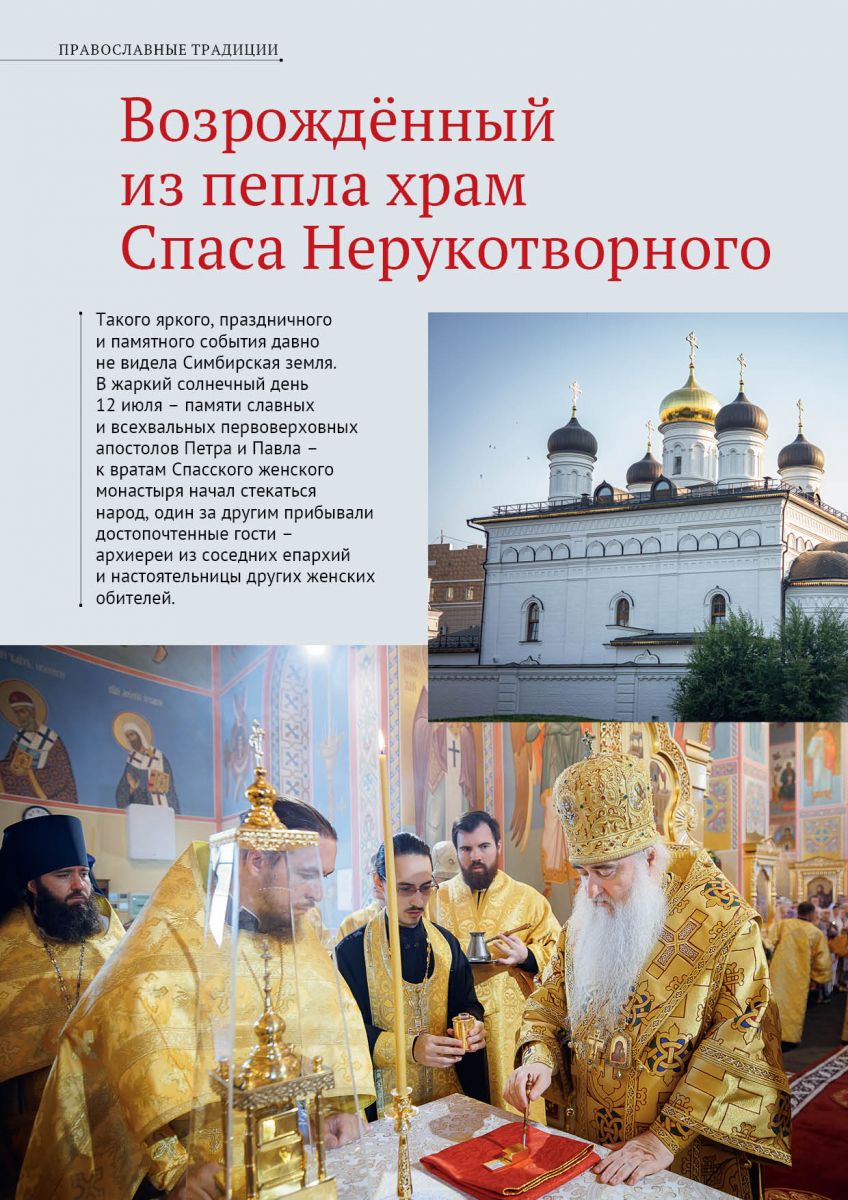 Особое место в номере занимает материал о недавнем освящении Спасского собора возрождённого Спасского женского монастыря, который в своё время посещал Александр Пушкин. Архитектор Павел Кормишин в интервью поделился историей разработки проектов новых храмов Ульяновска. В статье «Вечный путь» Нафанаил Николаев рассказывает о крестных ходах с чудотворной иконой Казанской Божией Матери по Симбирской земле и о людях, встреченных на этом пути. Трогательные очерки посвящены святителю Патриарху Тихону, священномученику Неофиту Любимову, а также почитаемым пастырям — старцу Иерониму и иеромонаху Пантелеимону из Санаксарского монастыря, протоиерею Павлу Алексахину из Красных Ключей Самарской области.