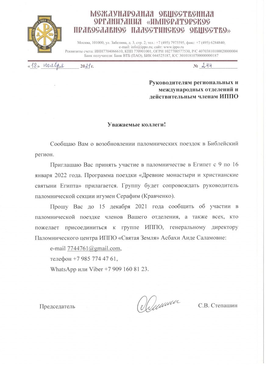 Просим до 15 декабря 2021 года сообщить о Вашем участии или участии членов Вашего отделения генеральному директору Паломнического центра ИППО «Святая Земля» Аиде Асбахи.