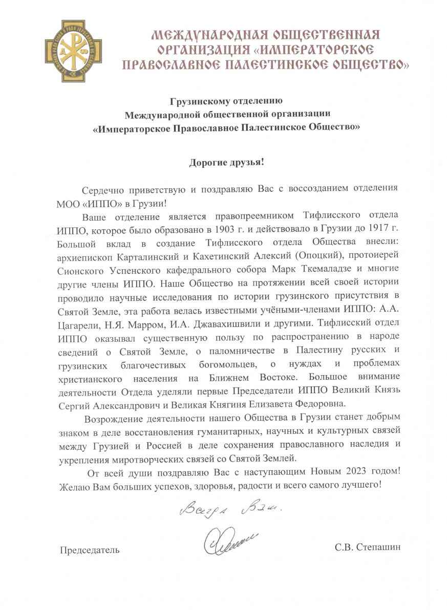 Приветствие в адрес членов грузинского Отделения Общества направил Председатель ИППО Сергей Степашин.