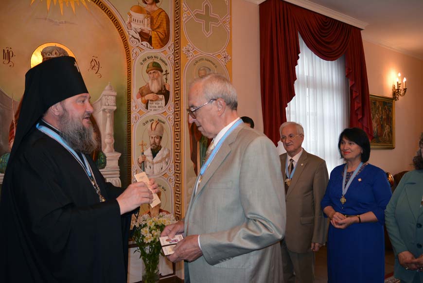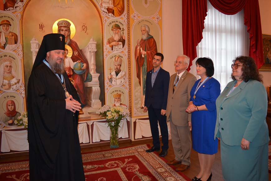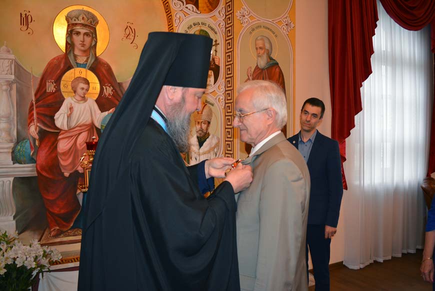 В ходе встречи правящий архиерей вручил профессору С. И. Берилу патриаршую медаль «В память 100-летия восстановления Патриаршества в Русской Православной Церкви».