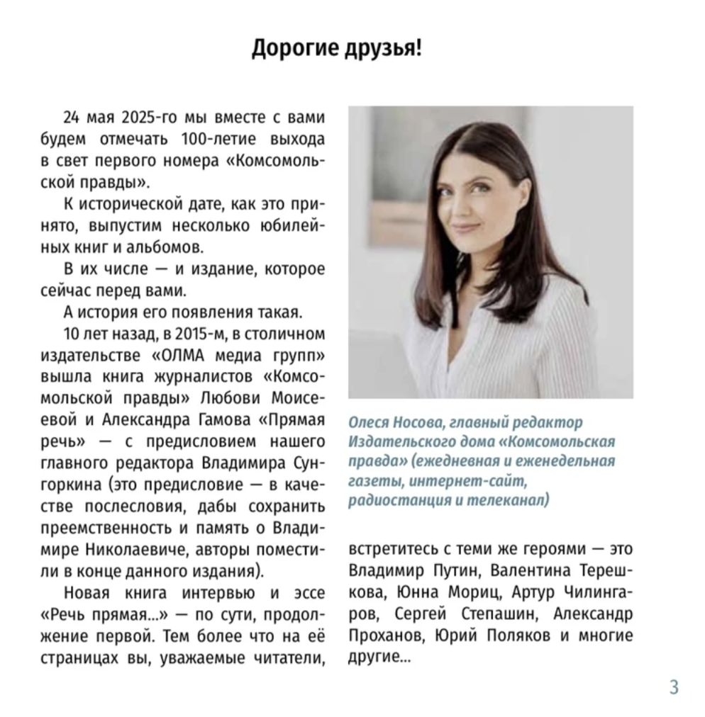 «24 мая 2025-го мы вместе с вами будем отмечать 100-летие выхода в свет первого номера «Комсомольской правды», - пишет в предисловии к изданию главный редактор, генеральный директор «Комсомольской правды» Олеся Носова. - К исторической дате, как это принято, выпустим несколько юбилейных книг и альбомов. В их числе - и издание, которое сейчас перед вами…