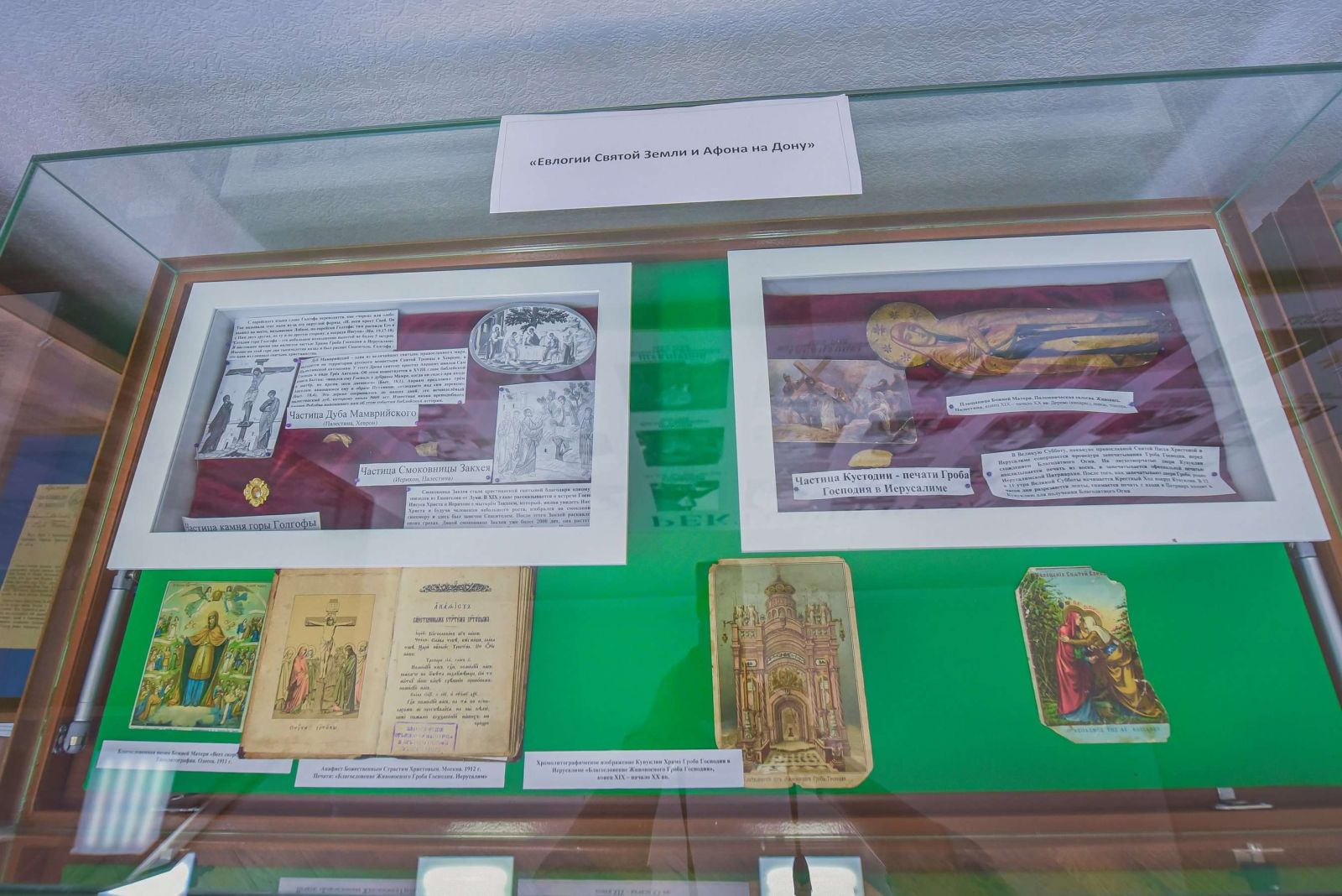 Среди экспонатов были представлены: паломническая плащаница Божией Матери на кипарисовой доске из Гефсимании (Иерусалим, конец XIX века), письма на Дон 1903 года архиепископа Фаворского Стефана, наместника Вифлеемского (Иерусалимский Патриархат), крест арабской работы конца XIX века, инкрустированный перламутром, Палестинский листок 1902 года издания, книги с печатями-благословениями из Иерусалима начала XX века и другие предметы – реликвии Святой Земли и Афона.