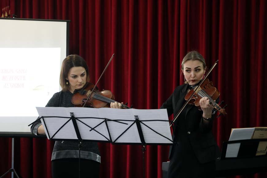 Повествование о книгах сопровождали стихи и живая музыка (фортепиано, альт, скрипка, саксофон) в исполнении преподавателей и студентов Шахтинского музыкального колледжа, а также выставка старопечатных и современных православных книг.