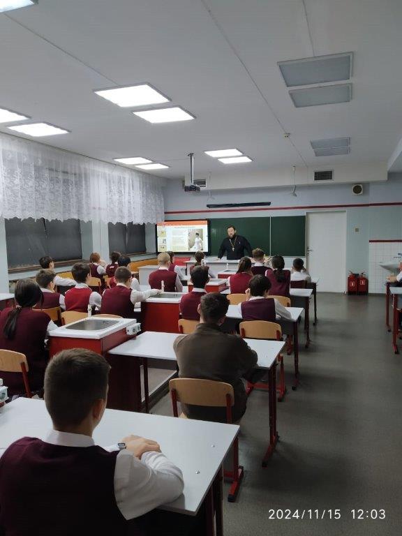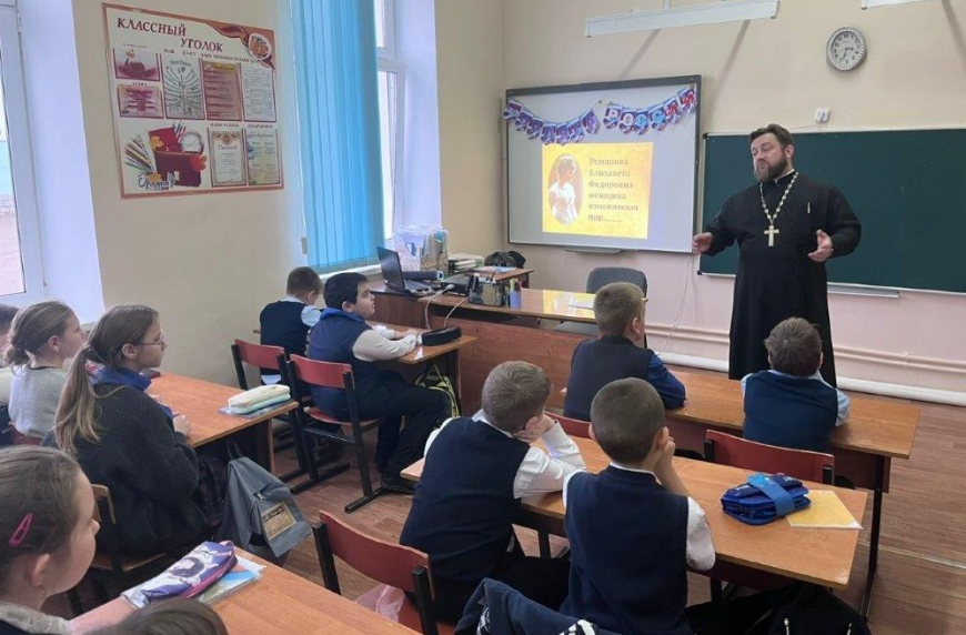 Священнослужитель выступил с презентацией по теме урока. Учащиеся с интересом слушали рассказ о непростой судьбе Великой княгини-основательницы Марфо-Мариинской обители милосердия, оставившей неизгладимый след в истории нашей страны и всего мира.