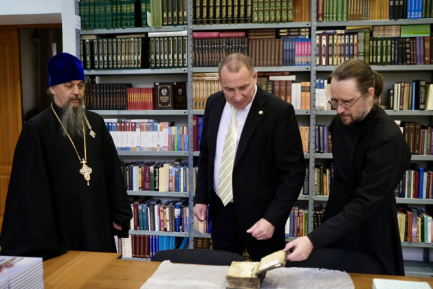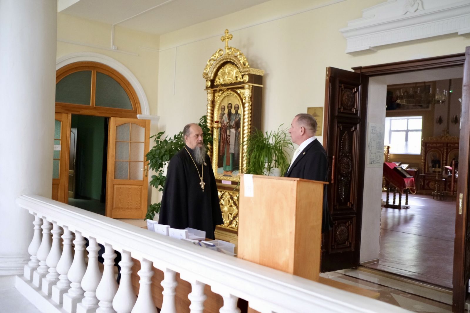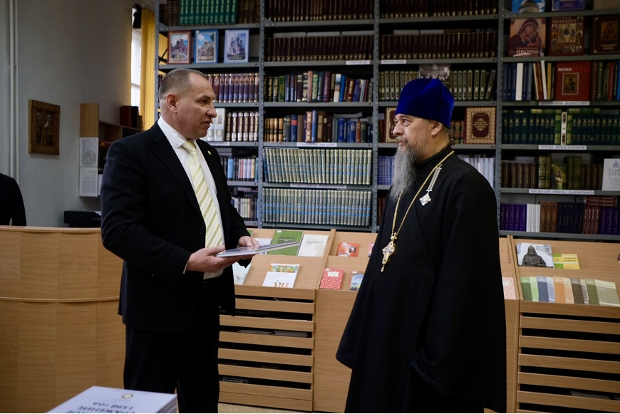 Протоиерей Павел поблагодарил Андрея Владимировича за пополнение обширной библиотеки семинарии, насчитывающей порядка 30 тысяч книг, и провел экскурсию по высшему учебному заведению.