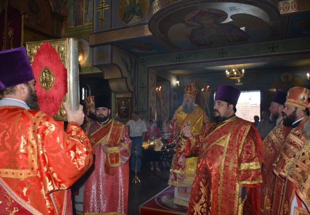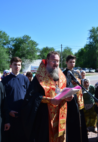 Высокопреосвященнейший Владыка Савва прочел молитву новомученикам и исповедникам Церкви Русской, после чего окропил всех присутствующих святой водой и обратился к ним с архипастырским словом. После чего образ священномученика Николая был внесен в данный храм.