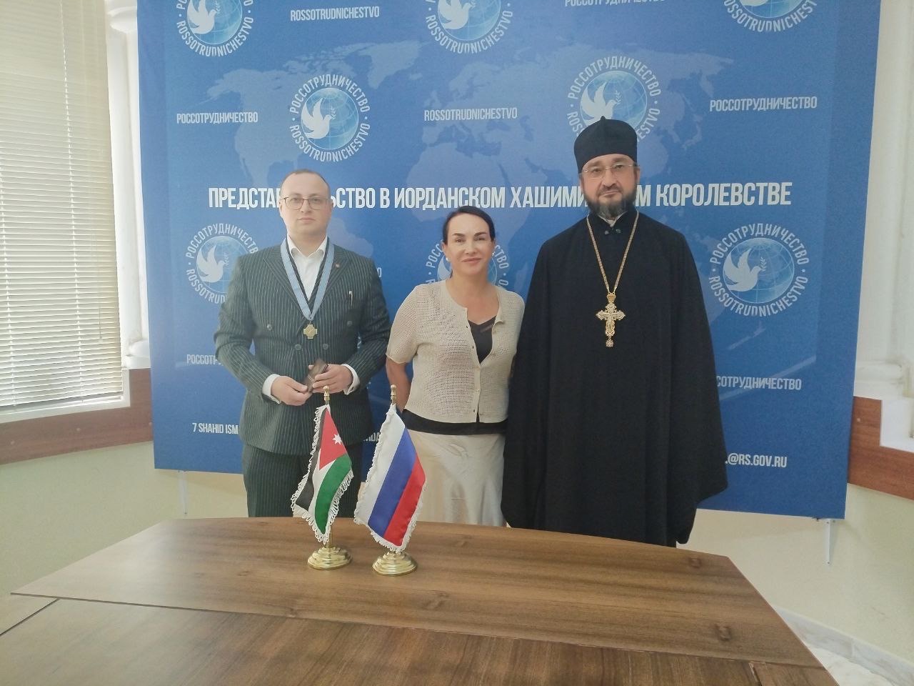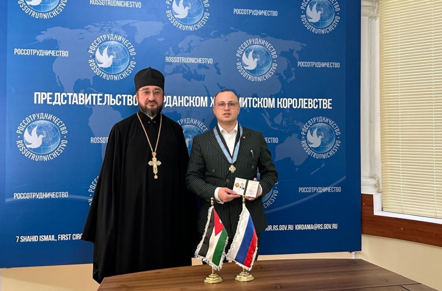 4 октября 2025 года в Аммане по поручению Председателя Императорского Православного Палестинского Общества Сергея Степашина руководитель Паломнической секции ИППО игумен Серафим (Кравченко) вручил знак и удостоверение действительного члена ИППО руководителю представительства Россотрудничества в Иордании Рубену Газанчяну.