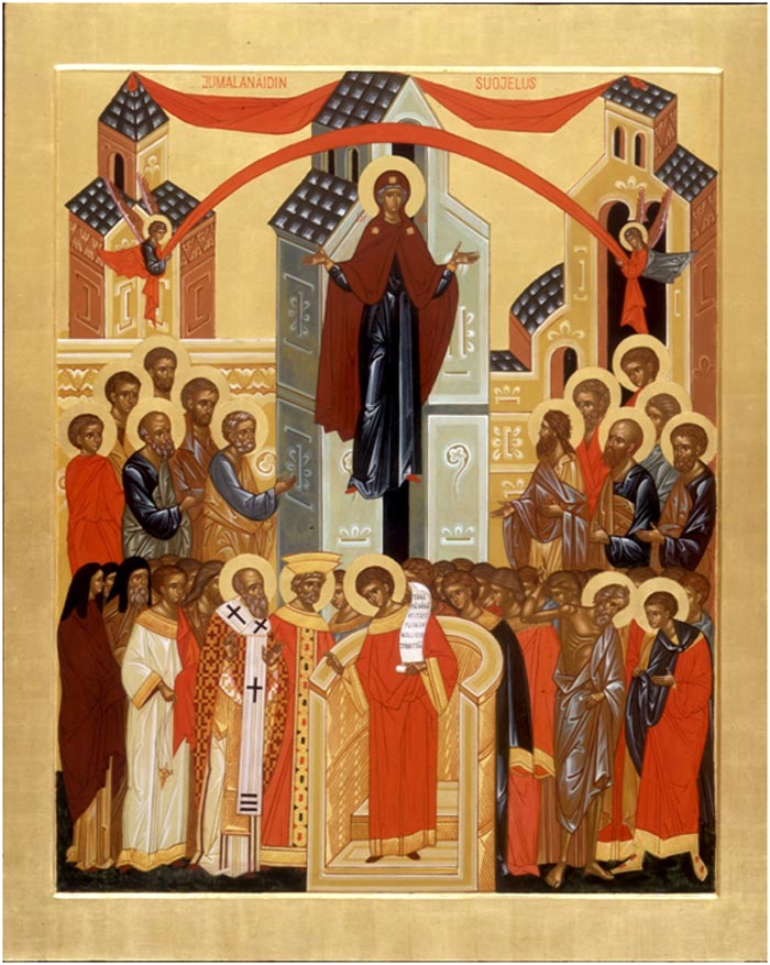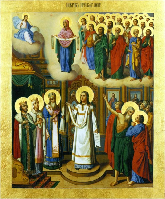 «Видишь ли ты Госпожу и Владычицу Мира?» Он же ответил: «Да, отец мой духовный». И они видели, как Богородица, преклонив Свои колени, долго молилась, прося за стоящих вокруг людей. И когда Она окончила молитву, сняла с Себя Мафорий и, взяв его Своими пречистыми руками, распростёрла над всеми стоящими в храме. И в течение долгого времени видели Андрей и Епифаний покров Богородицы, который был распростёрт над народом и излучал Славу Божию».