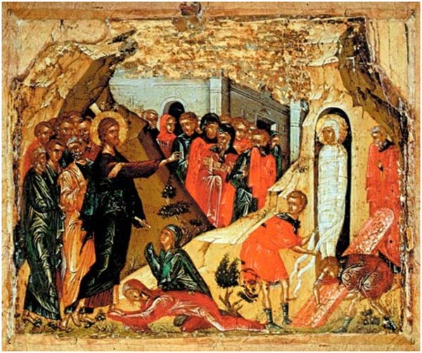 На пути к дому умершего друга Христос встретил его сестру Марфу и сказал ей: «Я есмь воскресение и жизнь; верующий в Меня, если и умрёт, оживёт. И всякий живущий и верующий в Меня не умрёт вовек. Веришь ли сему?»