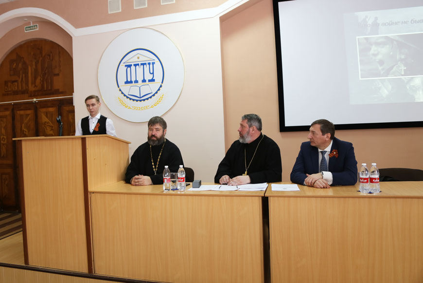 О церковной благотворительности в годы Великой Отечественной войны собравшимся рассказала студентка Екатерина Русинова, которая привела множество конкретных фактов и цифр, отражающих церковный вклад в дело Победы. Тема роли полкового духовенства в истории многочисленных побед русского оружия была рассмотрена в докладе студентки Елизаветы Сысоевой. Исследование значения образа святого Георгия Победоносца в русской культуре и георгиевской символики ратных подвигов наших предков и соотечественников представила студентка Екатерина Качканогова. О роли Русской Православной Церкви в сохранении памяти о Великой Отечественной войне и недопустимости искажений истории рассказали студенты Дмитрий Ряднов и Александра Крючек. Значение веры на войне представил студент Виктор Безруков. Заведующий кафедрой, доцент иерей Владислав Касьянов дал высокую оценку студенческим выступлениям и презентациям, пожелал юным участникам форума дальнейших успехов в изучении отечественной истории и духовной культуры.