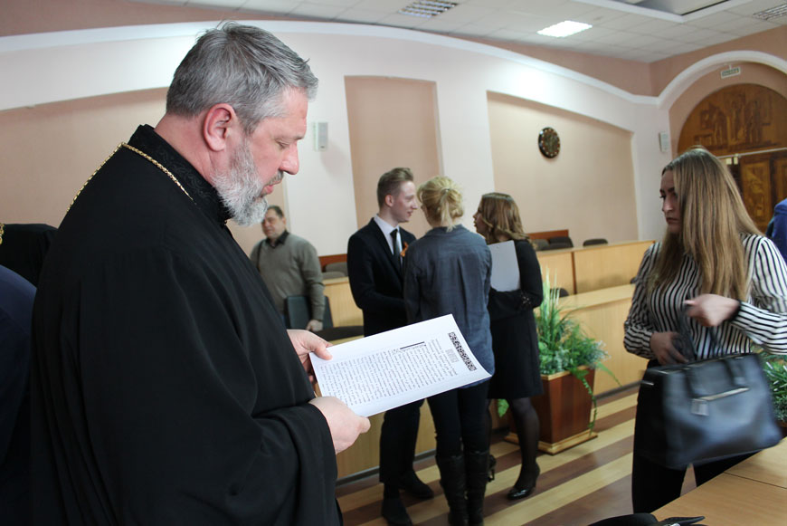 Перед началом работы конференции её участники посетили домовый храм института во имя святого апостола и евангелиста Иоанна Богослова, где была совершена заупокойная лития по погибшим и усопшим участникам Великой Отечественной войны. Совершая молитвенное поминовение вождей и воинов, на поле брани убиенных, заведующий кафедрой православной культуры и теологии, кандидат философских наук, доцент, председатель отдела по церковной благотворительности и социальному служению Шахтинской епархии иерей Владислав Касьянов объяснил собравшимся значение этого действия как для усопших воинов и ветеранов, так и для наследников Победы. Отец Владислав прочёл обращение Святейшего Патриарха Московского и всея Руси Кирилла по случаю Дня православной молодёжи. В совершении литии и в работе конференции принял участие заместитель председателя отдела по работе с молодёжью Шахтинской епархии, заместитель председателя епархиального отдела по церковной благотворительности и социальному служению по утверждению трезвости иерей Андрей Ковалёв.