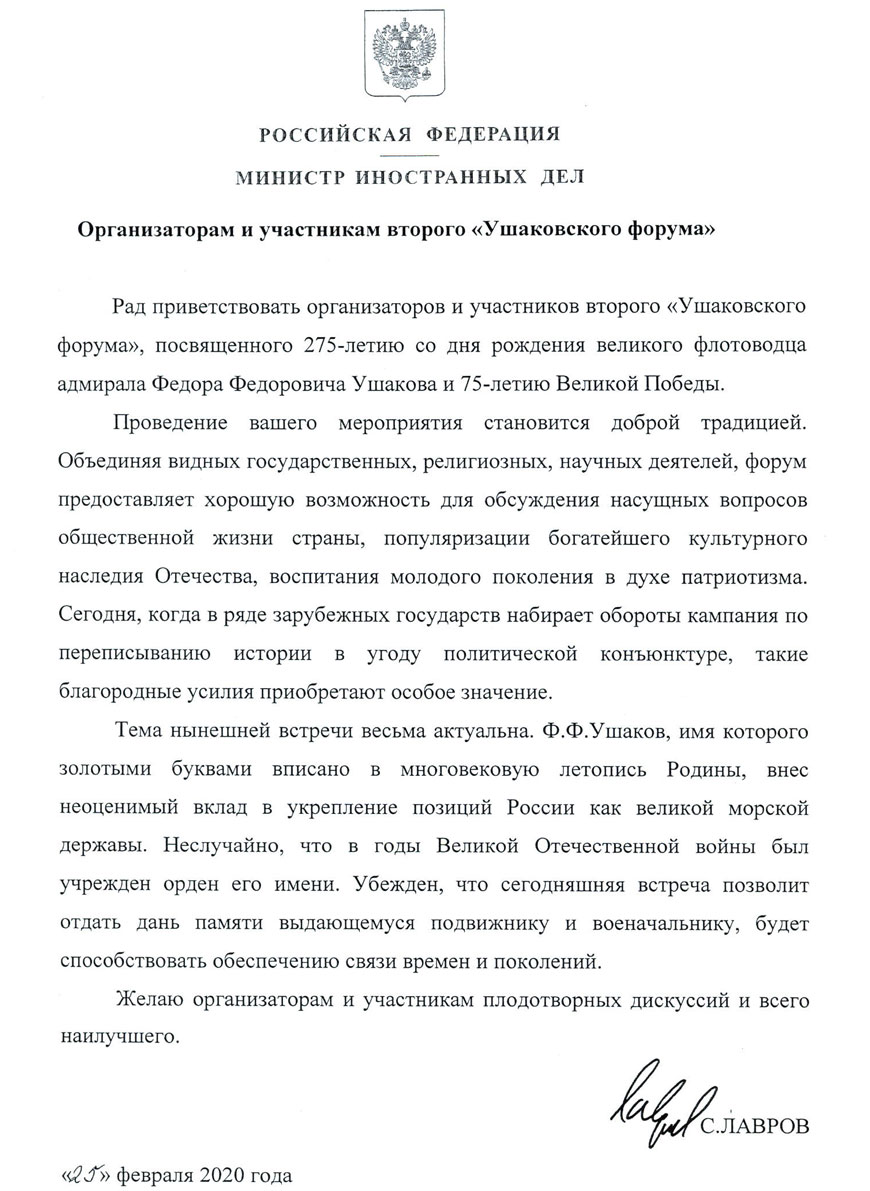 Сергей Лавров направил приветствие организаторам и участникам второго Ушаковского форума