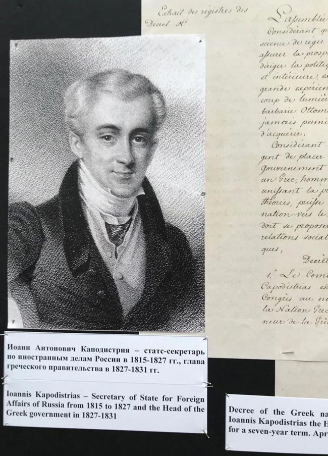 Ярчайший пример – Иоанн Каподистрия, роль и место которого в истории наших стран трудно переоценить. Декрет о его избрании главой греческого правительства представлен на этой выставке.